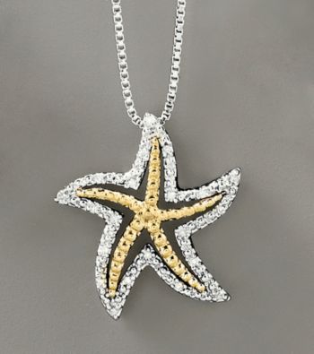 Necklaces, Chains and Chokers. A shining two-tone starfish pendant with diamond details suspended from a sterling silver chain. .06 ct. t.w. diamond accents 14k gold central detail on starfish Sterling silver/14k gold ImportedCt. t.w. = carat total weight. All weights are approximate. Variance must be plus or minus .05 carat. Diamond grades may vary. Some styles include single-cut diamonds.
